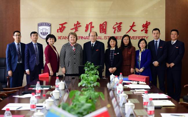 2018年3月12日,哈萨克斯坦欧亚大学第一副校长莫乐达江瓦·阿赛木古丽一行访问我校,随行的有欧亚大学语言系主任加尔肯别克瓦·俏丽潘、实践哈萨克斯坦语教研室主任库勒曼夫·库安德克和中文教研室主任阿克巴尔汗·达吾列特阿力。我校校长王军哲、副校长李雪茹亲切会见了来宾一行,国际合作与交流处、俄语学院、汉学院等相关部门负责人参加了会谈。