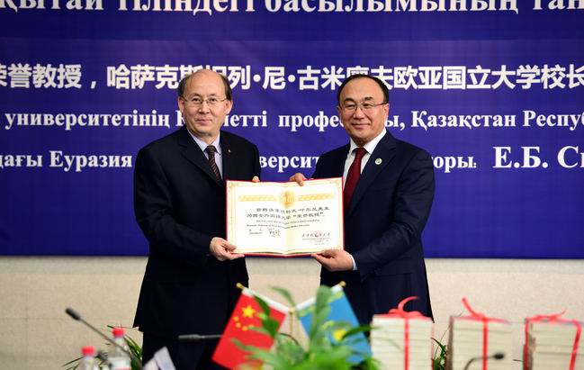 首发仪式结束后,进行了双方校长的荣誉教授聘任及荣誉勋章授予仪式。王军哲校长代表学校聘任塞德科夫·叶尔兰校长为bet 365备用网址荣誉教授;塞德科夫·叶尔兰校长代表哈萨克斯坦欧亚大学向王军哲校长授予古米廖夫教育勋章。(供稿单位:国际合作与交流处 俄语学院 汉学院 国际关系学院 文字:田越崎 图片:党小湘 审核:吴耀武)
