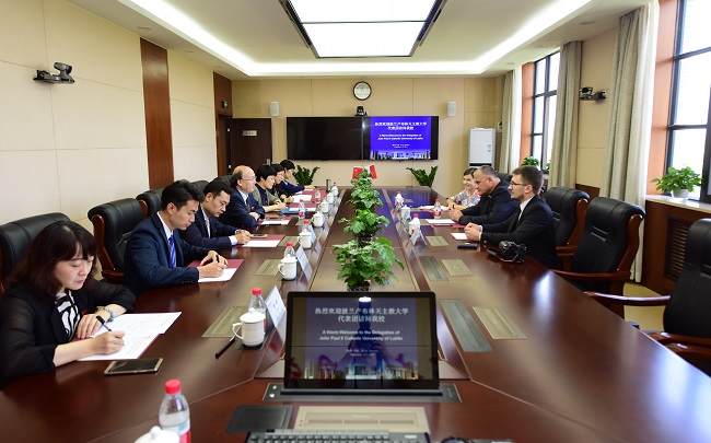 随后,王校长协同有关部门负责人与安东尼·德宾斯基校长一行进行了深入务实的会谈。王校长再次对德宾斯基校长及卢布林天主教大学在我校开设波兰语专业和建立波兰研究中心上发挥的作用表示肯定。他强调,卢布林天主教大学派遣至我校的2名波兰语教师沃伊切赫·克卢舍夫斯基教授和帕维尔·扎哈尔维奇博士已经顺利抵达我校,并将于本周开始对我校波兰语专业的新生开始授课。相信在2名外教的努力下,我校波兰语专业的学生们一定会受益匪浅。此外,我校拟派遣至卢布林天主教大学的中文教授王琪也将于本月内抵达波兰,王校长也特别为她送上祝福,希望她旅途顺利并将我们博大精深的汉语及中国文化传播到美丽的波兰。